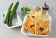 キュウリは両端を切り落とし、斜めに浅く(キュウリの厚みの半分以内)全体に切り込みを入れ、反対側にも斜めに切り込みを入れる。4~6つに切り分け塩水につける。