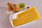 フライパンにオリーブ油、ニンニクを入れて弱めの中火にかける。ニンニクが薄いキツネ色になれば、刻み赤唐辛子、ゆで上がったスパゲティを加え、強火にして、手早く炒めあわせ、塩、コショウで味を調える。