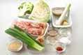<合わせだれ>のショウガは皮をむき、みじん切りにする。白ネギは縦に4〜5本切り込みを入れ、みじん切りにする。<合わせだれ>を混ぜ合わせておく。
