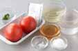 トマトはヘタをくり抜き、熱湯につけて皮が少し破れれば、すぐに冷水にとって皮をむく。(湯むきをする、といいます。)種もスプーン等で取り、ひと口大に切っておく。