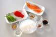 全体に油がまわったらシシトウ、赤ピーマン、ほぐした鮭を加えて炒め合わせ<調味料>を加える。