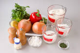 玉ネギ、赤パプリカを小麦粉と牛乳の<衣>に通し、<合わせパン粉>を付ける。
