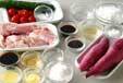 各々、器に4の大学芋、5の鶏の唐揚げを盛り、唐揚げにプチトマト、軽く汁気を切ったキュウリを添える。