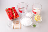 <イチゴジャム>を作る。イチゴはきれいに水洗いし、水気を拭き取る。ステンレス又はホーロー鍋にイチゴ、レモン汁、砂糖を入れて強火にかける。