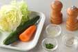 キュウリは両端を少し切り落として縦縞に皮をむき、5mm幅の斜め切りにする。サッと水洗いし、水気を切ってレタスと合わせ、冷やしておく。(縦縞に皮をむくのはピーラーを使うと便利ですよ)