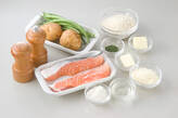 <パン粉ソース>を作る。別のフライパンにバターを中火で熱しパン粉が薄いキツネ色になるまで炒め、パルメザンチーズとドライパセリを加えて混ぜ合わせる。2のサーモンムニエルにかける。レンジで蒸し焼きにしたジャガイモはラップをはずし、十字の切り込みを入れてバターをのせ、塩をふる。