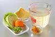 鍋にだし汁を中火で熱し、煮立てばキャベツ、ニンジン、油揚げを加える。キャベツがしんなりすれば、みそを溶き入れて火を止める。