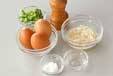 卵白は泡立て器でしっかり角が立つまで泡立て、卵黄は<調味料>を加えてしっかり混ぜ合わせる(メレンゲ)。卵黄のボウルに水煮ホタテを汁ごと加え、よく混ぜ合わせる。