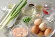 ボウルなどに1人分づつ、卵を割りほぐし、カニ身とその汁、白ネギを加え、サッと混ぜ合わせる。
