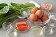 卵を割りほぐし、<調味料>、カニカマ、青菜を加えてよく混ぜ合わせ、2つに分ける。