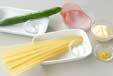 スパゲッティは半分に折って袋の表示通りの時間ゆで、ザルに上げる。