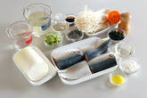 サバ切り身は皮側の身の厚い部分に切り込みを入れ、<下味>をからめる。