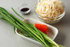 太モヤシは、出来れば根を取りたっぷりの水に放ち、パリッとすればザルに上げる。ニンジンは皮をむき縦細切りにする。ニラは水洗いし根元を切り落とし、3cmの長さに切る。