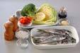 器に合わせキャベツを盛り、小アジを盛り付け、ブロッコリー、プチトマト、4つに切ったレモンを添える。