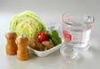 鍋に<スープ>の材料を入れて中火にかける。固形ブイヨンが煮溶ければピーマン、赤ピーマン、生シイタケを加え、塩コショウで味を整える。