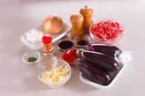 耐熱容器にナスを並べ、2の<ミートソース>を入れ、ピザ用チーズをのせる。ナスが容器の外にはみだしている場合は内側に折り込みむ。