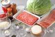 水気を軽く押さえたキャベツの葉を広げ、小麦粉を薄く振り掛け1の1/8量を俵型にまとめたものをのせる。巻きながら包み、ベーコンで巻き、巻き終わりを楊子で止める。