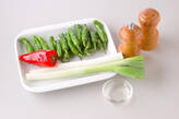 フライパンにサラダ油を中火で熱し、シシトウ、白ネギ、赤ピーマンを炒め合わせ、塩コショウで味を調え、器に盛る。