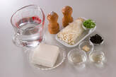 鍋に<スープ>の材料を入れて強火にかけ、チキンブイヨンを煮溶かし、煮立てば<調味料>、豆腐、エノキを加える。