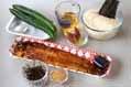 ウナギ蒲焼きは頭を落として縦半分に切り、横1cm幅に切る。