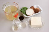 鍋にだし汁を入れて強火にかけ、煮立てば<調味料>、玉ネギを加える。