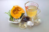 カボチャは種を取り、皮を所々削いでひとくち大に切る。