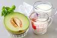 ミキサーにメロン、他の材料も加えて撹拌し、グラスに注ぎ、あればミントの葉を添える。