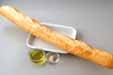 温めておいたオーブントースターでフランスパンを軽く焼き、ニンニクの切り口をパンにこすりつけて香りを付ける。