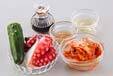<調味料>のボウルにゆでタコ足、キュウリ、白菜キムチを加え混ぜ合わせ、器に盛る。