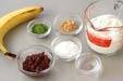 バナナは皮をむき、一口大に切り、フォーク等でバナナを粗くつぶし、プレーンヨーグルトと混ぜ合わせる。