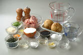 ボウルに<つくね>の材料を入れてよく練り、8~12個の小判型に形を整え、片栗粉を薄くまぶす。