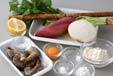 サツマイモは皮ごときれいに水洗いし、3cm長さの太めのせん切りにして、水に放つ。
