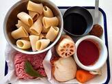 鍋にたっぷりの湯を沸かし塩を加え、飾り用のレンコンをサッとゆでて取り出す。続いてパッケリを加え、軽く沸騰が続く状態を保ちながら、表示時間より3分短くゆでる。