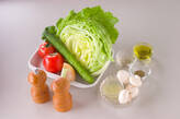 レタスは食べやすい大きさに手でちぎり、冷水に放ち、パリッとすればザルに上げ、しっかり水気をきる。