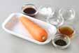 フライパンにゴマ油を強火で熱しニンジンを炒め、ニンジンに少し炒め色がついてくれば<調味料>をからめるように炒め合わせる。