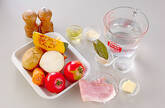 鍋にバターを熱してニンニクを入れ、香りが出てきたらベーコンを炒め、ベーコンから脂が出てきたら玉ネギを加え、しんなりしてきたらニンジン、ジャガイモ、カボチャも加えて炒め合わせる。