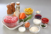 ボウルに合いびき肉、玉ネギ、ニンジン、パン粉、牛乳、卵、塩コショウ、ナツメグを入れ、よく粘りが出るまで手で混ぜ合わせる。