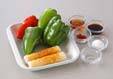 ピーマン、赤ピーマンは縦半分に切る。ヘタと種を取り、縦に細切りにする。長い場合は長さを半分に切る。