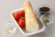 器に長芋を盛り<ワサビじょうゆ>を掛け、プチトマトを添える。