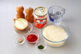 炊飯器に洗い米、水煮トマト、ケチャップを入れ、3合分の水量線まで<スープ>を加える。(足りない場合は水を加えて下さい)玉ネギを加え、塩コショウをしてスイッチを入れる。