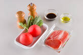 器にトマトを敷き、生ハムをのせ、バジルをちりばめ、オリーブ油、バルサミコ酢、塩、コショウを振り掛ける。レタスやルッコラを加えても美味しいです!