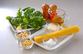 <ジェノベーゼソース>のバジルの葉は、飾り用バジルを残し、軸から葉をつみ取る。ミキサーに全ての材料を入れペースト状に撹拌する。