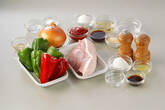 フライパンの油を切り、玉ネギ、赤ピーマン、ピーマンを強火で炒め、<合わせ調味料>を加え、再び煮立てば<水溶き片栗>でとろみをつける。