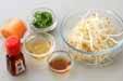 たっぷりの熱湯でモヤシ、ニンジンをサッとゆで、ザルに上げる。