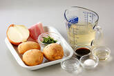 鍋に水切りしたジャガイモ、玉ネギ、だし汁、酒、みりん、砂糖を入れて中火にかけ、煮立てばベーコンを加え、クツクツ煮立っている位の火加減で10分煮る。