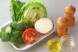ボウルにサニーレタス、玉ネギ、キュウリ、ブロッコリーを入れ、<ドレッシング>の材料を加えてサッと混ぜ合わせ、器に盛り付け、トマトを添える。