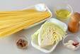 パスタがゆで上がる1~2分前にキャベツを加えて一緒にゆで、ザルに上げる。