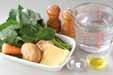 ニンジンがしんなりすれば<スープ>を加え、煮立てばシイタケを加え1~2分煮て、塩コショウで味を整える。