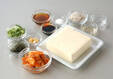 器に水切りした豆腐をのせ、刻んだ白菜キムチ、刻みのり、刻みネギをのせる。