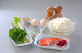 塩鮭、ニンニクの芽、梅干しを加えて全体に炒め合わせる。最後に大葉、白ゴマを加えザックリ混ぜて塩コショウで味を調え、器に盛り分ける。